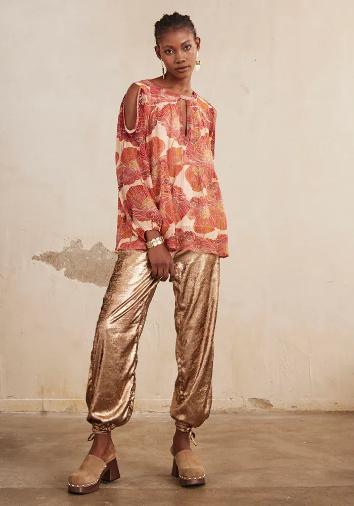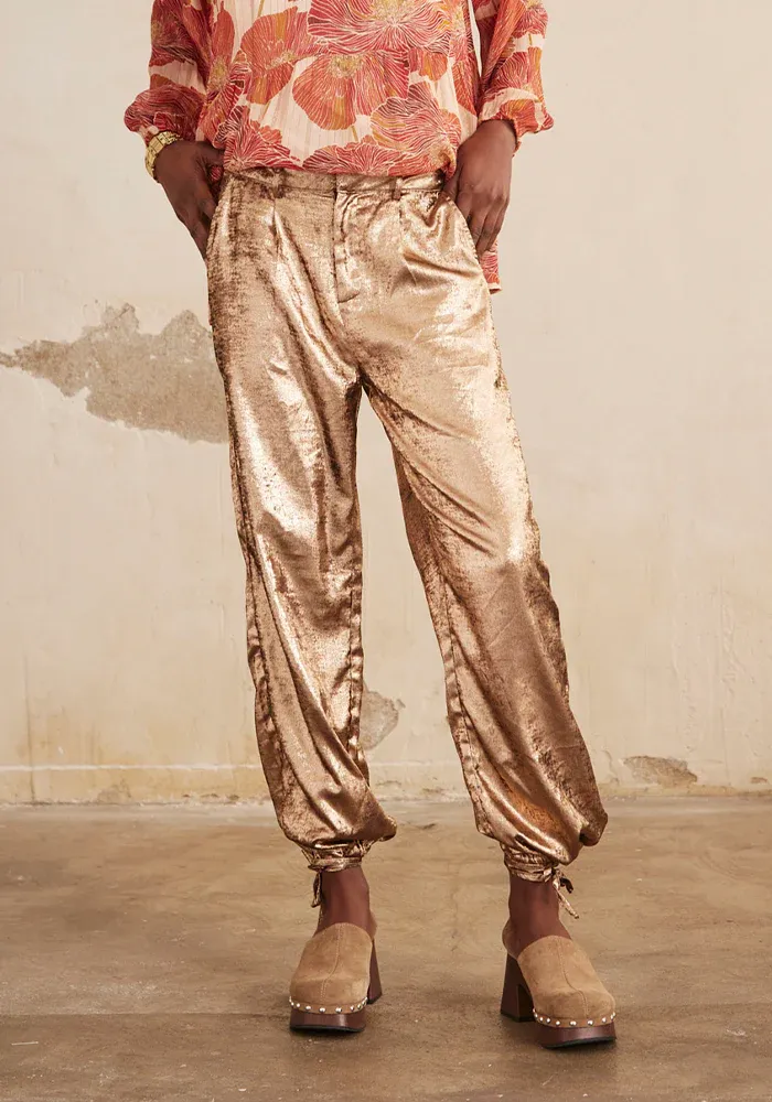 Pantalon Jatziri rose gold, droit et resserré aux chevilles dans un tissus lurex vieilli.