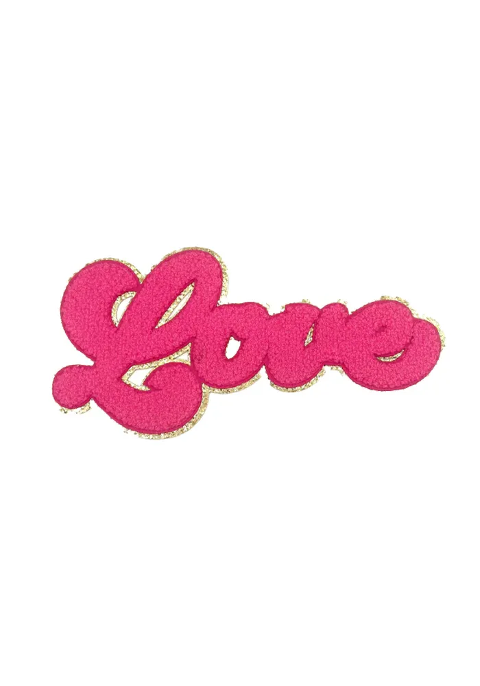 Thermocollant Columbia Love en bouclette rose et entouré de paillettes dorées. Ce patch peut être placé la pochette personnalisable de votre choix !