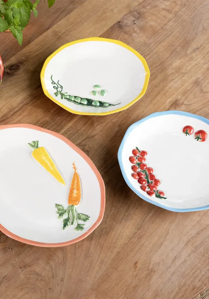 Plat Pomodoro en céramique blanche avec une grappe de tomates rouge en relief et le contour bleu clair.