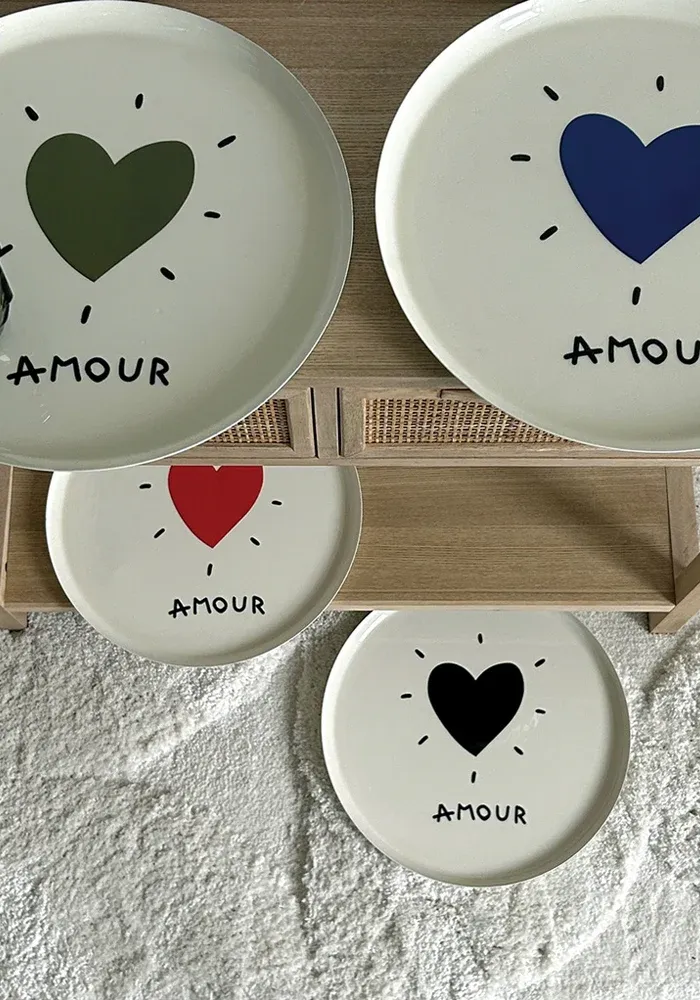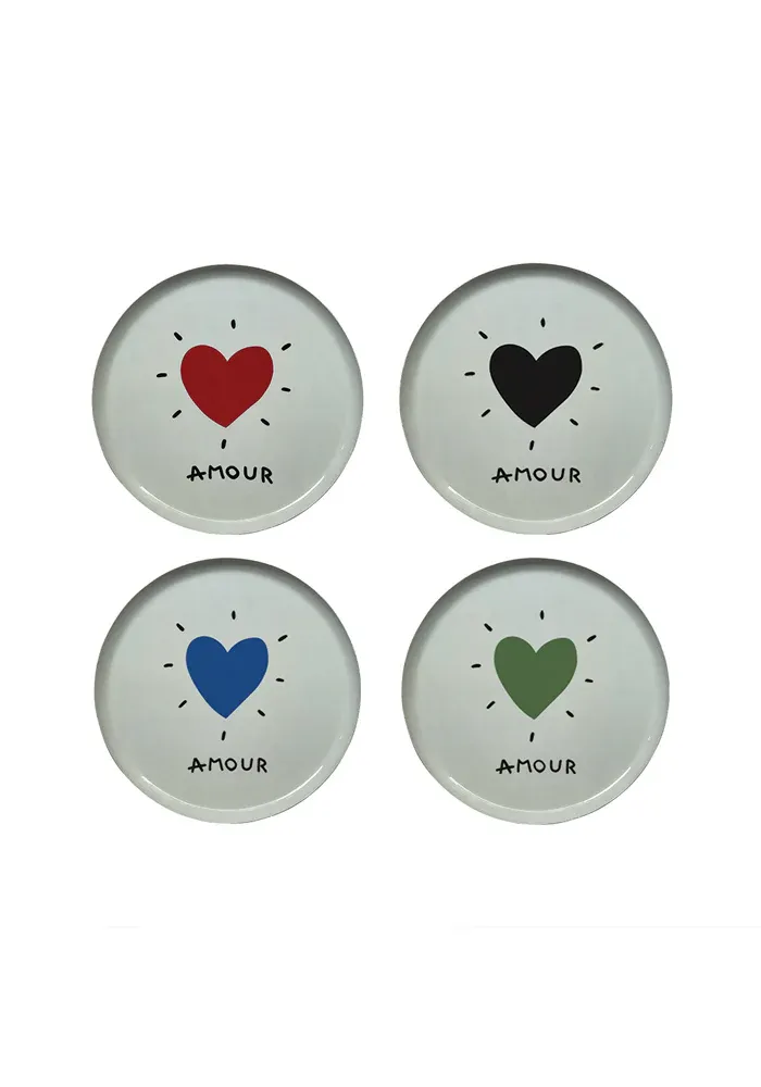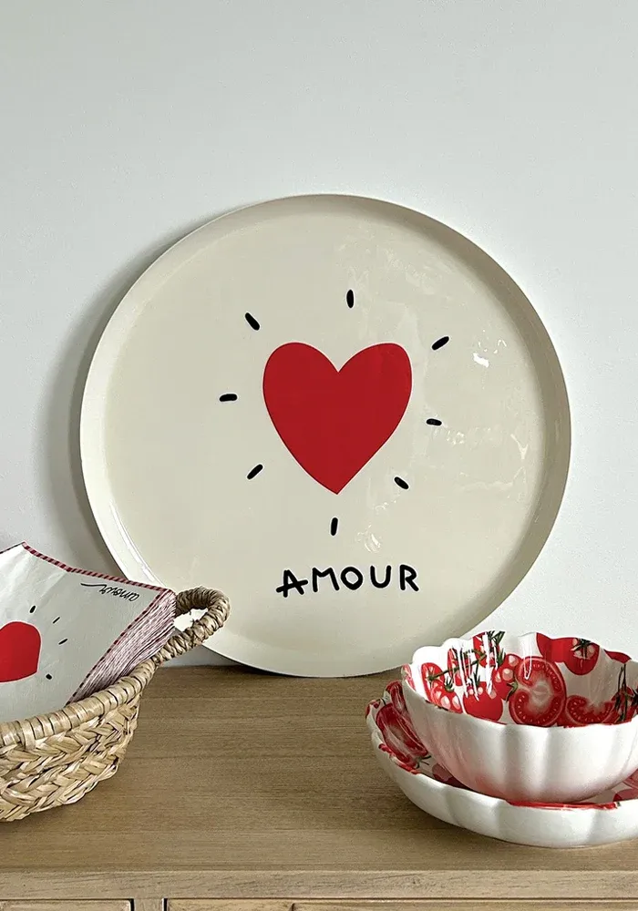 Plateau rond en métal laqué blanc avec un coeur et le le message « amour ».