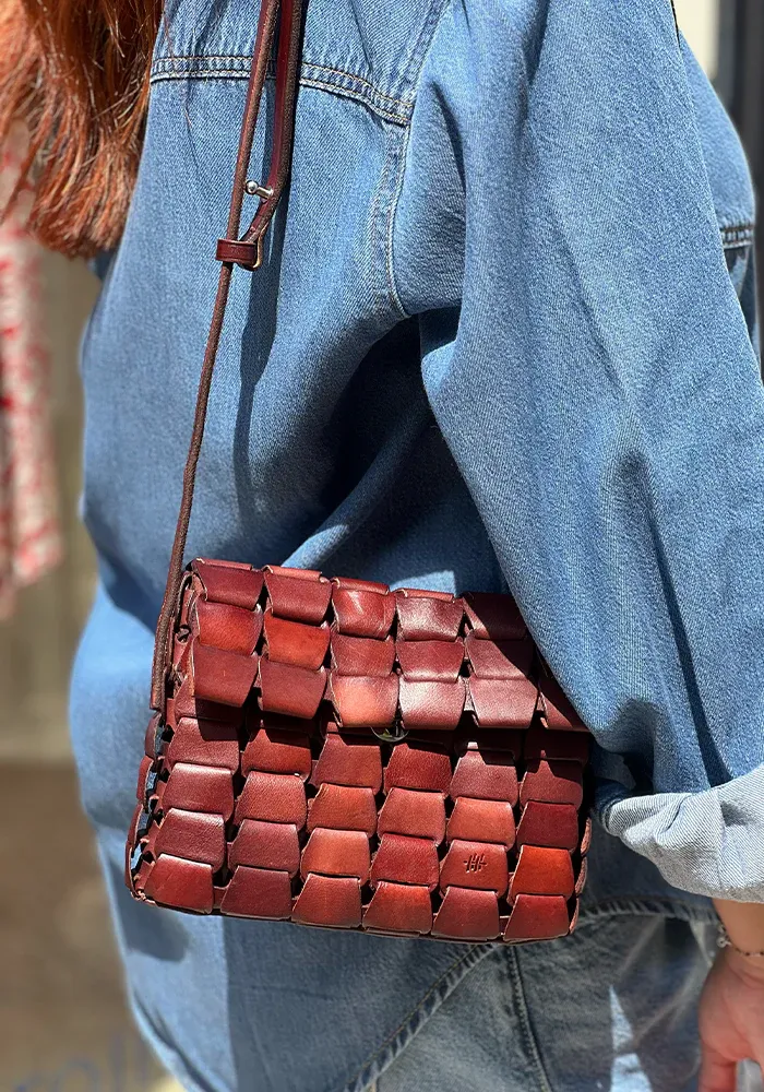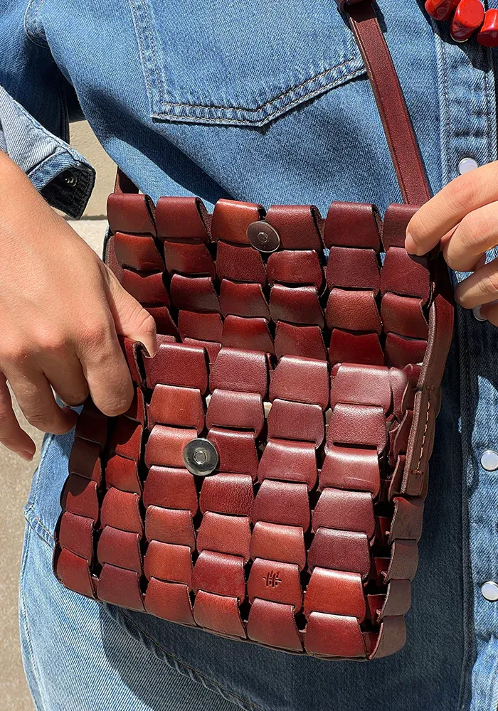 Pochette Link en cuir tressé à la main avec une bandoulière ajustable.
