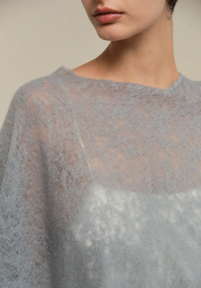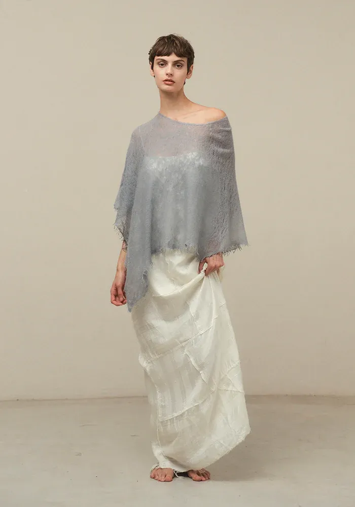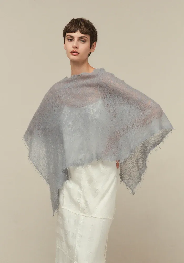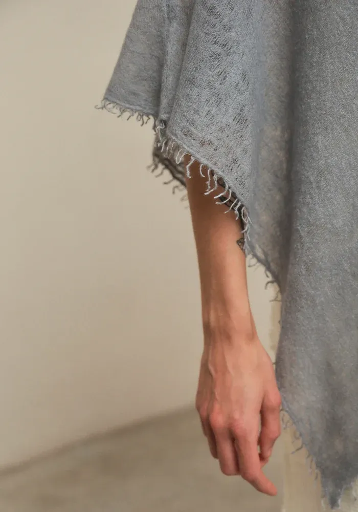 Poncho Semi Felted court en cachemire avec une coupe pointe, un col rond et des franges sur les bords.