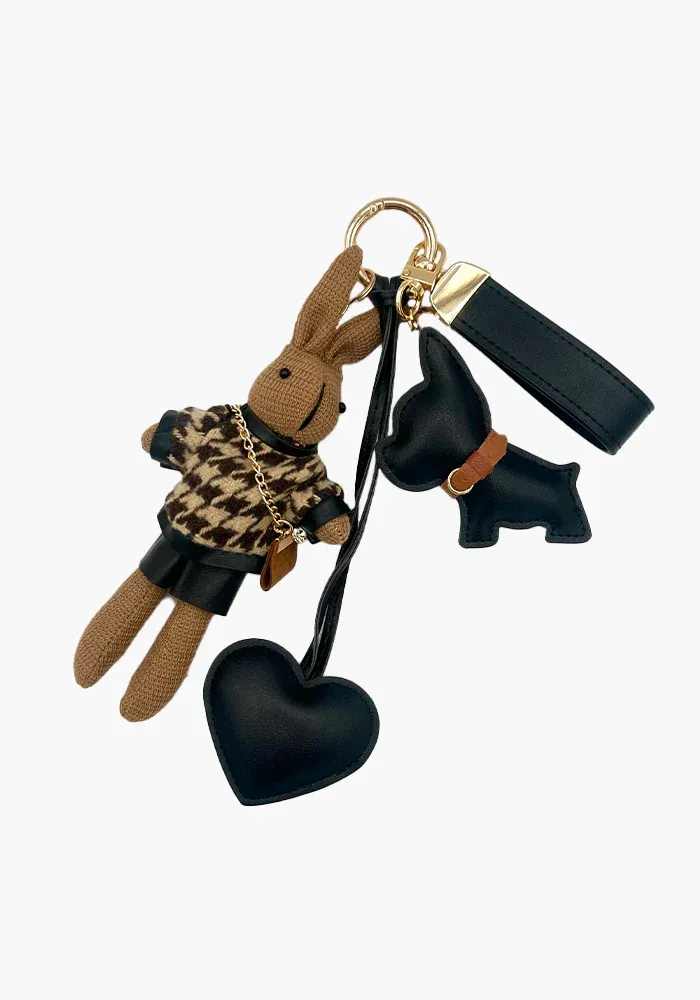 Porte-clés Édouard avec un lapin, un chien, un coeur et une boucle en similicuir noir.