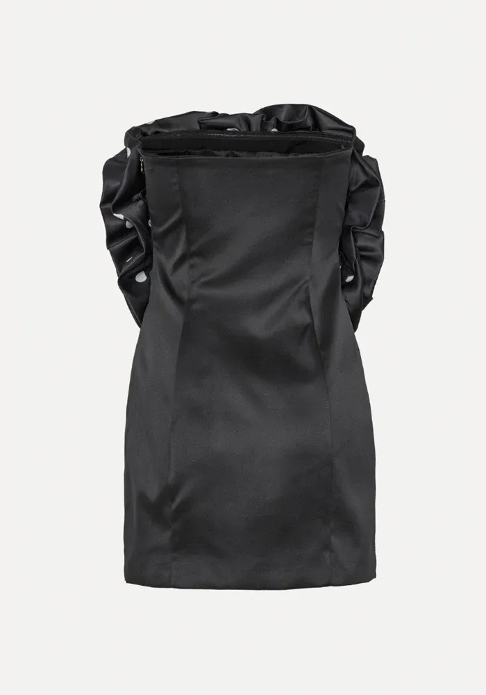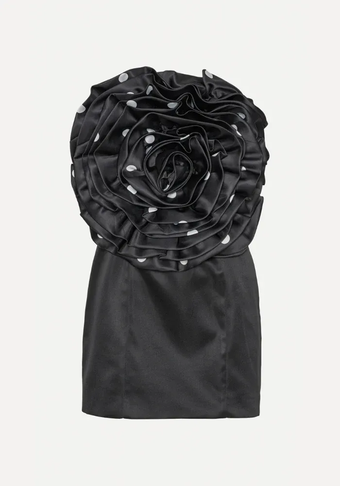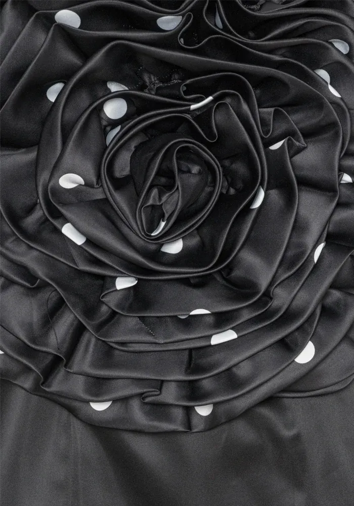 Robe Big Flower bustier, courte, noire satinée avec une grande fleurs à pois blancs sur la poitrine.