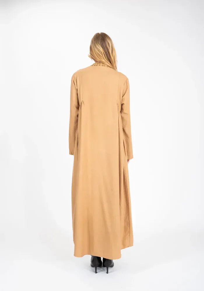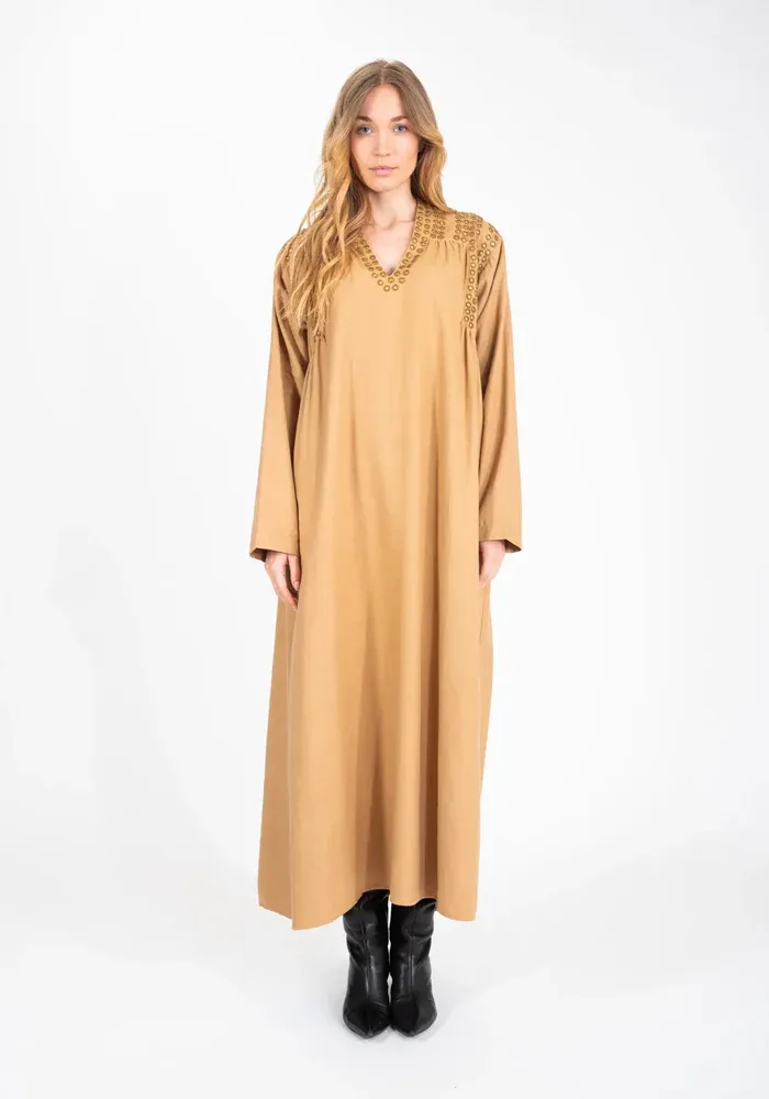 Robe longue Bling en tissu camel, mélangeant coton et laine, ornée de sequins métalliques dorés.