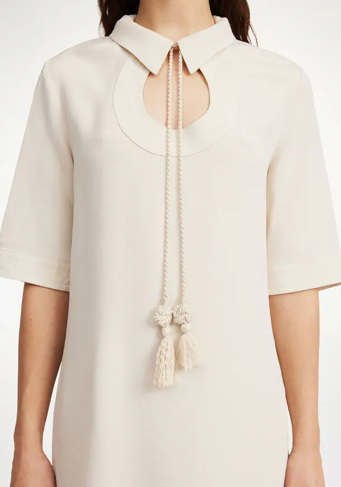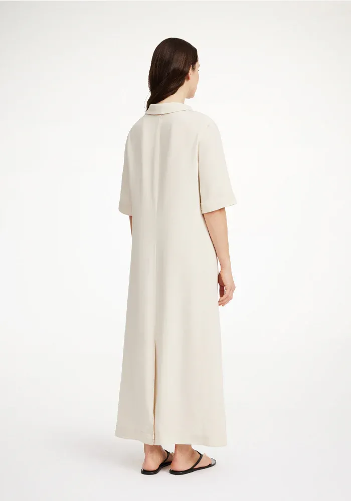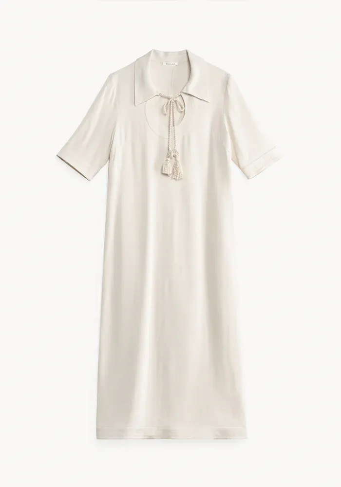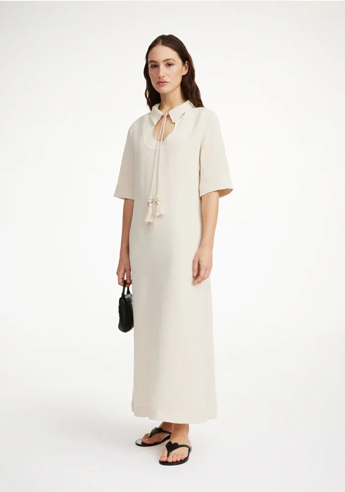 Robe Brinney longue à manches courtes avec une encolure arrondie se fermant avec deux cordelettes.