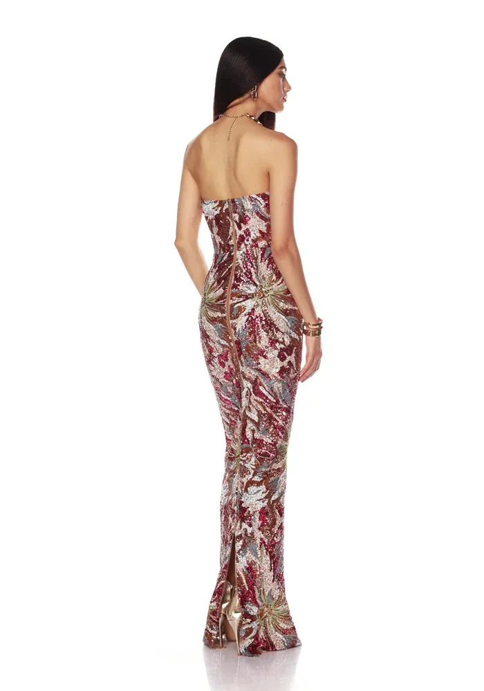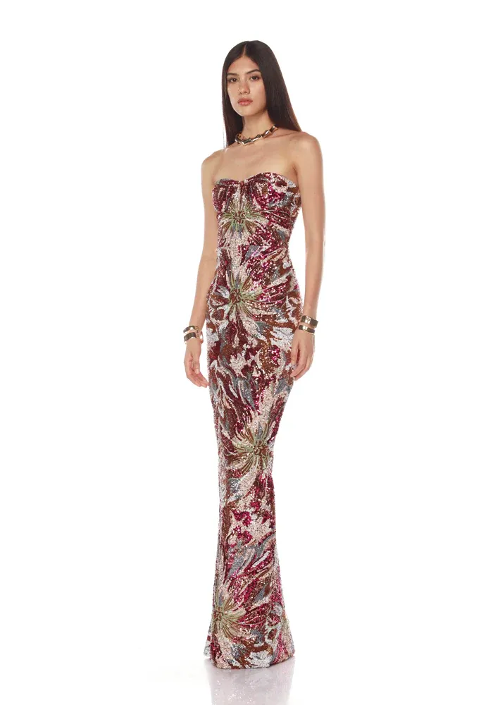 Robe Dahlia longue et bustier avec des fleurs en sequins fuschia.