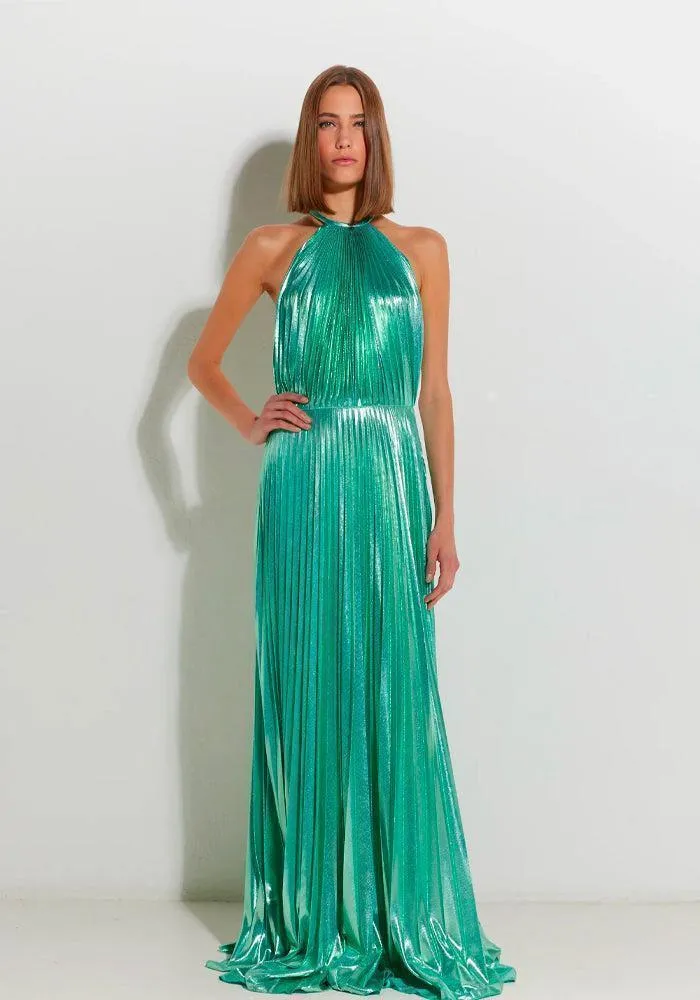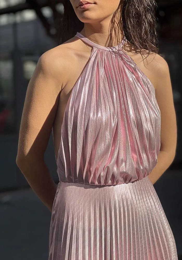 Robe Isadora longue plissée rose métallisé. La robe est dos nu avec deux bretelles, sans manche, avec un col ras le cou.