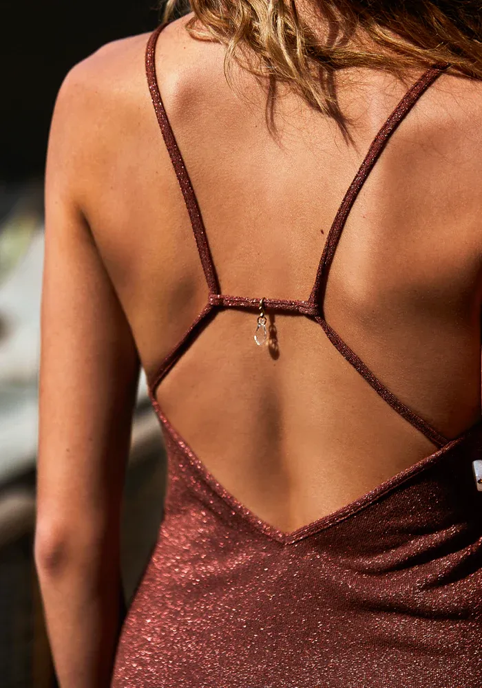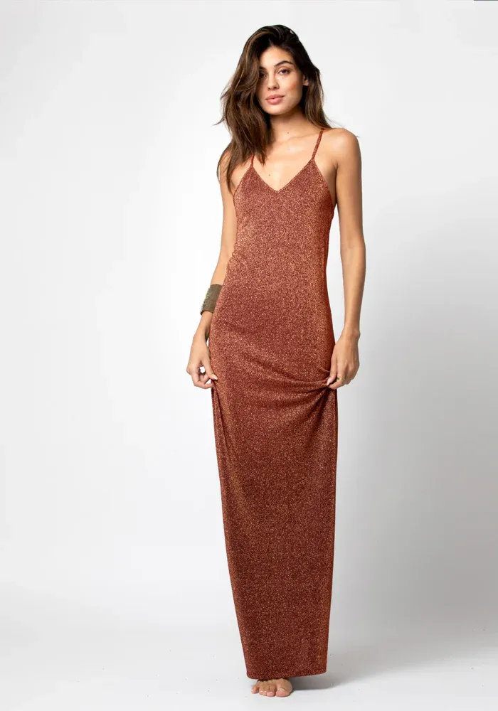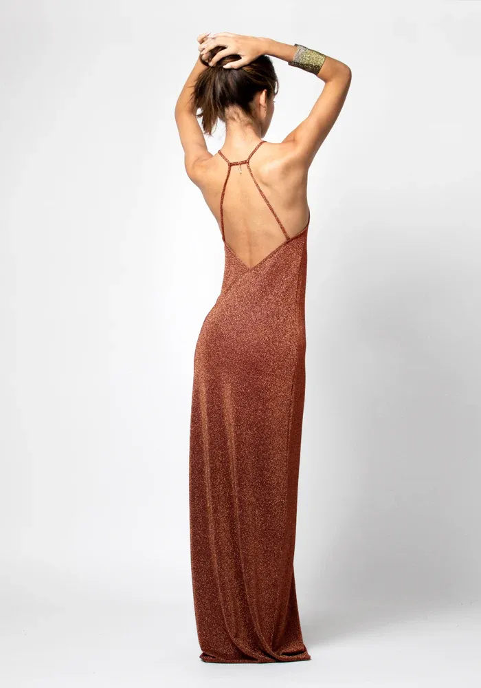 Robe Jila longue dans un tissu lurex avec des fines bretelles décorées d’un bijou transparent dans le dos nu.