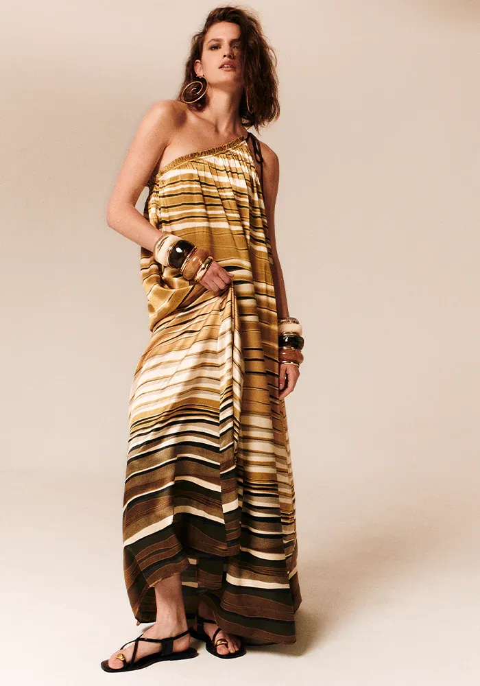 Robe Julia asymétrique longue resserrée au niveau du coup avec des rayures.