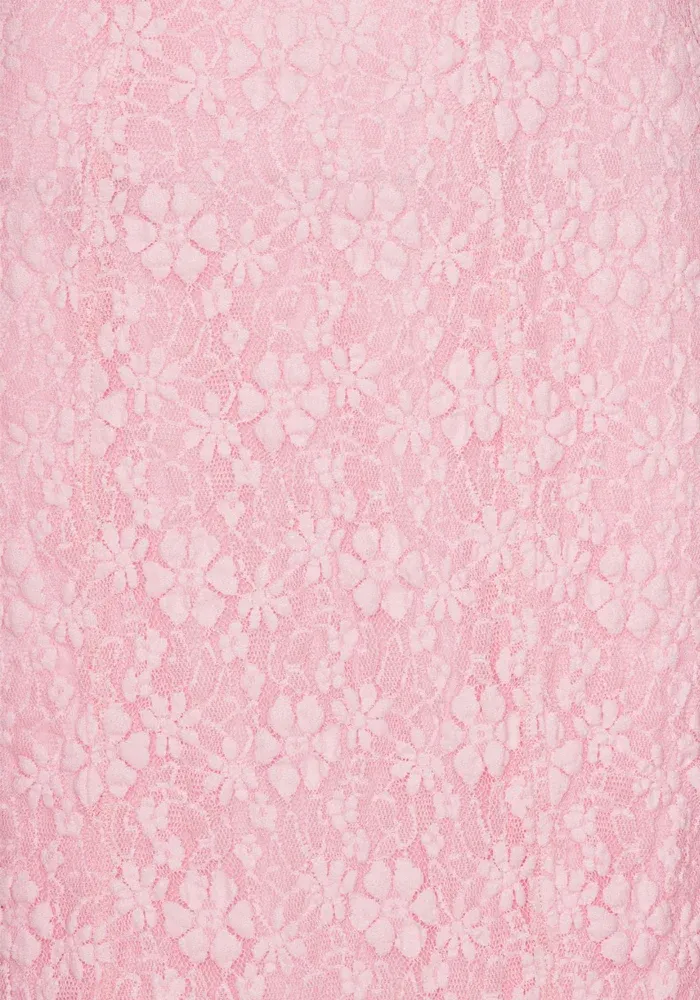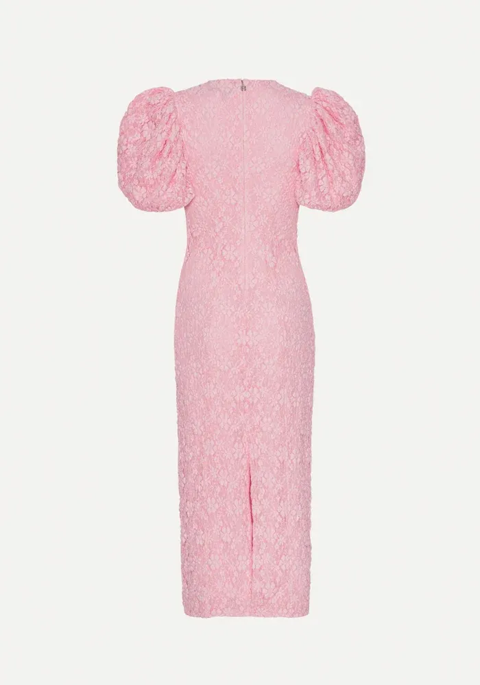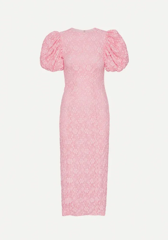 Robe Lace Midi Fitted à manches ballons avec de la dentelle rose pale.