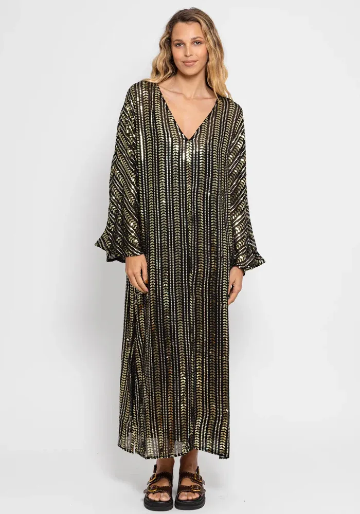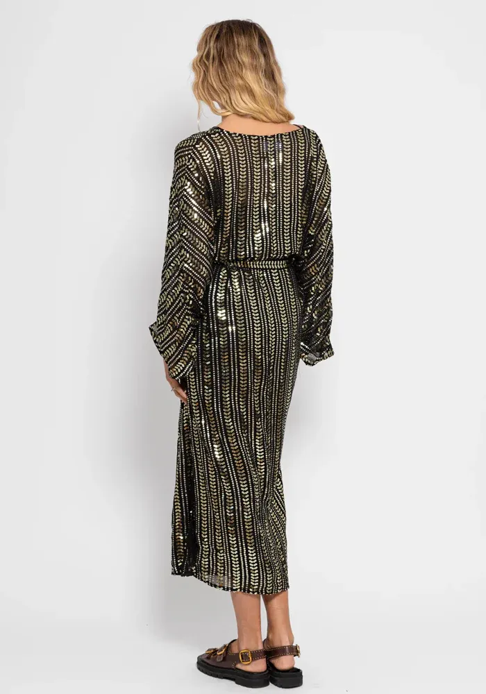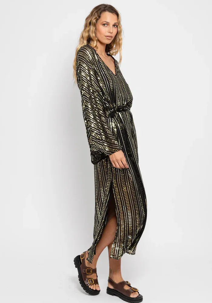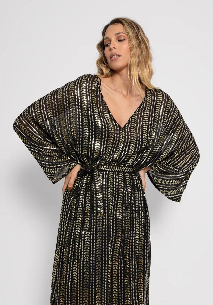 Robe Leandra Bora Bora longue avec un col V des manches longues amples et des bandes verticales en sequins.