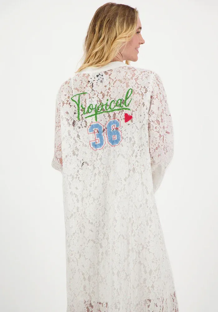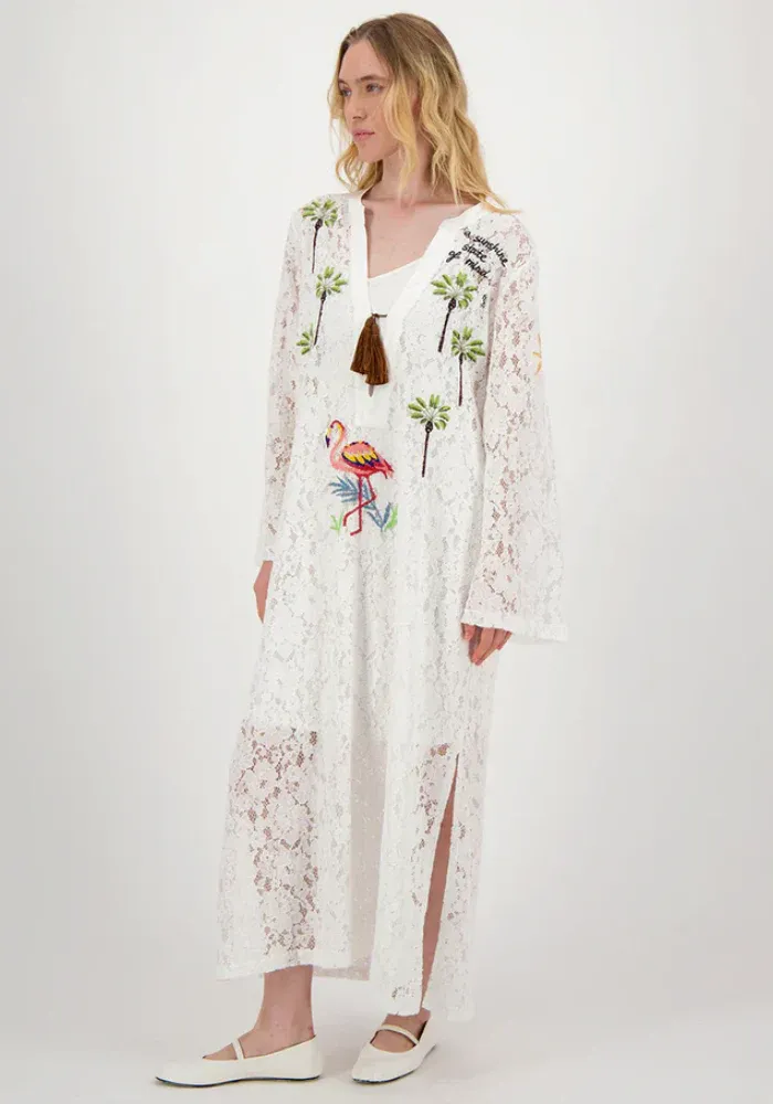 Robe Adela longue en dentelle de couleur blanche avec des échancrures sur les côtés et des broderies à l’avant et l’arrière de la robe.