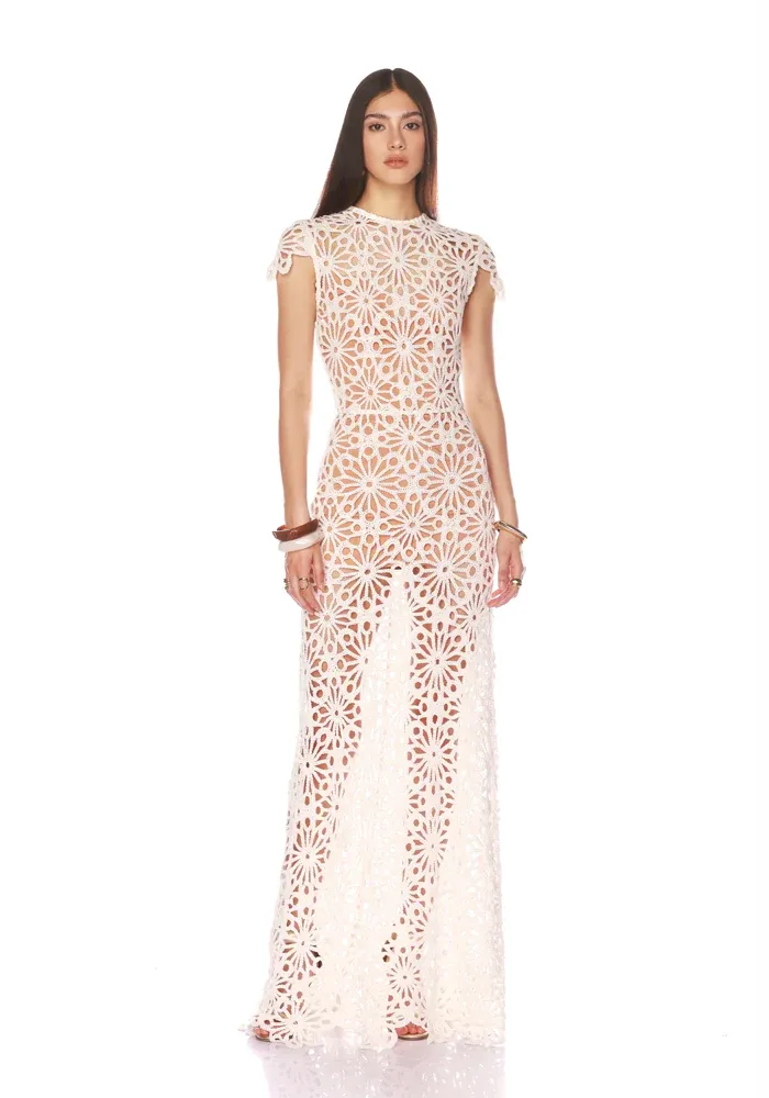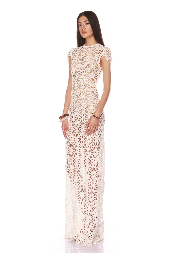 Robe Marley longue avec des manches courtes et tout en crochet blanc.