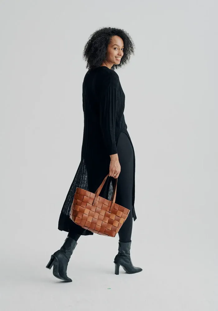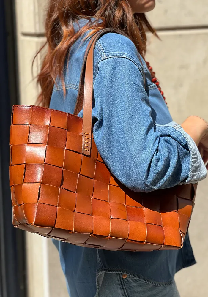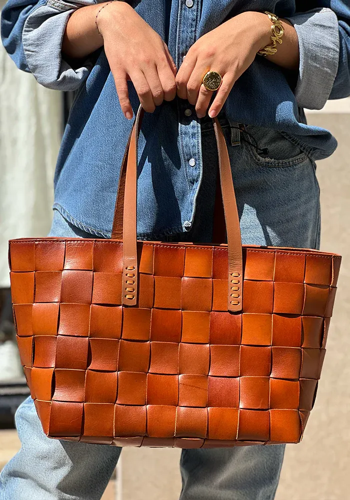 Sac Japan en cuir de vache tissé à la main avec une doublure dans la couleur Tan.