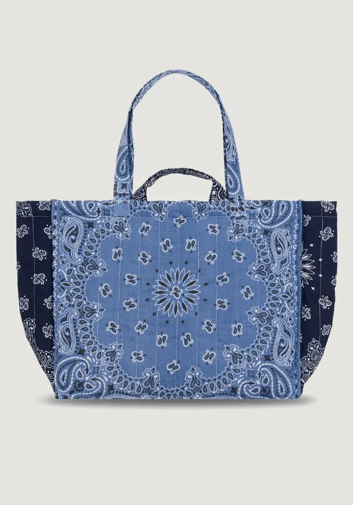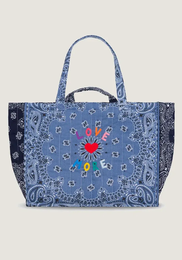 Sac maxi cabas matelassé avec un motif bandana et brodé avec le message Love More. Ce sac est entièrement matelassé afin de le rendre plus résistant. Avec 4 anses, vous pourrez à la fois porter votre sac à l’épaule et à la main.