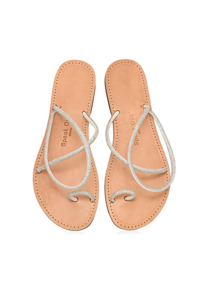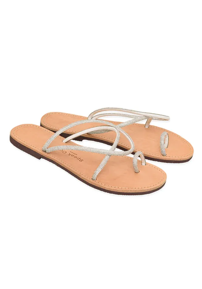 Sandales Chris en cuir avec des lanières recouvertes de strass qui passe sur le gros orteil, le pied et la cheville.