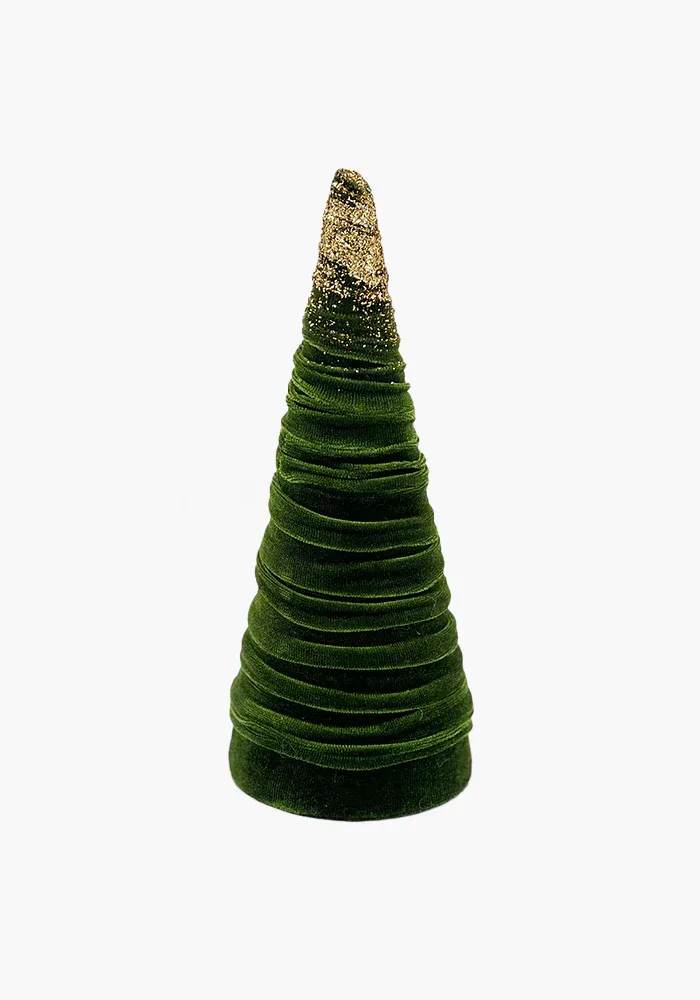 Sapin en velours avec le sommet décoré de paillettes dorées.
