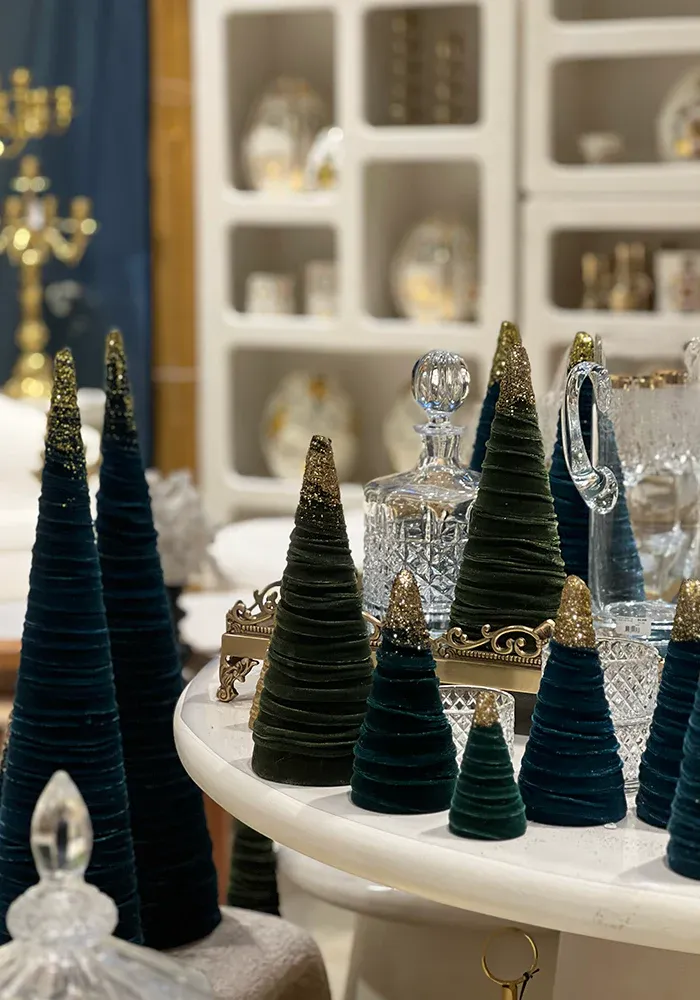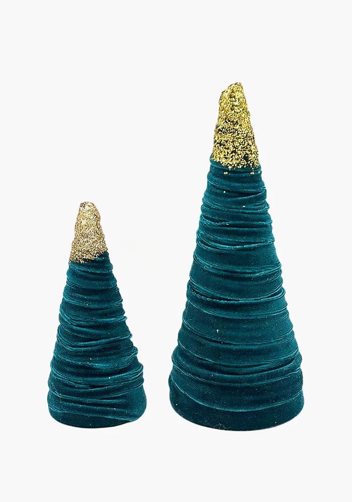 Sapin en velours avec le sommet décoré de paillettes dorées.