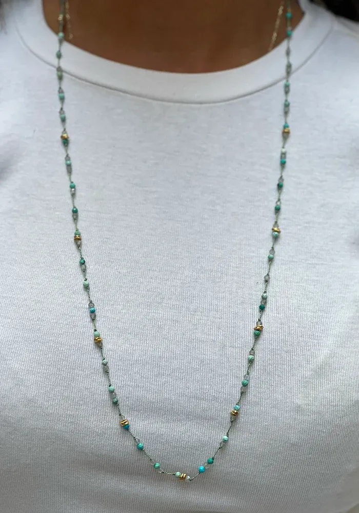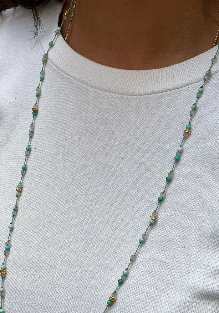 Sautoir Bali avec des perles en turquoise, labradorite et plaqué or.