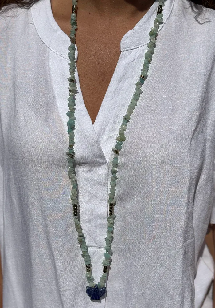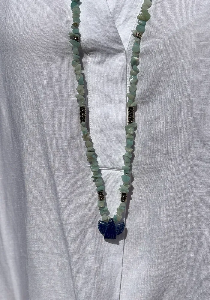 Ce collier long est composé de petites pierres de corail bleu. Il est orné d’un pendentif en forme d’aigle sculpté dans une pierre de lapis, symbole de renaissance et de force.