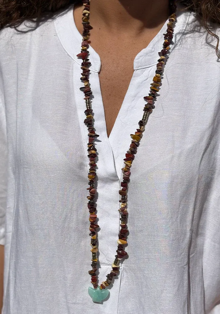 Ce collier long est composé de petites pierres d’œil de tigre. Il est orné d’un pendentif en forme d’aigle sculpté dans une pierre d’amazonite , symbole de renaissance et de force.