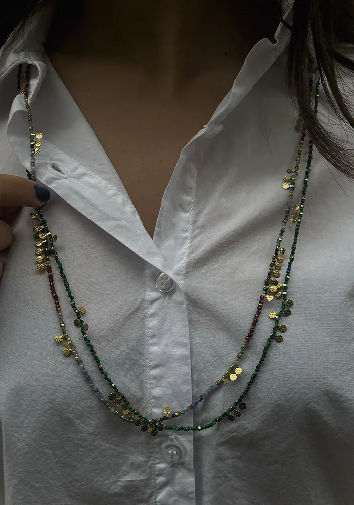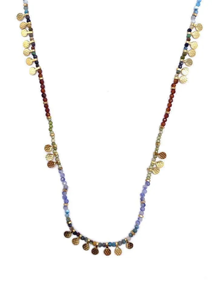 Sautoir Lara avec des perles en pierre et des pastilles martelées en acier jaune.