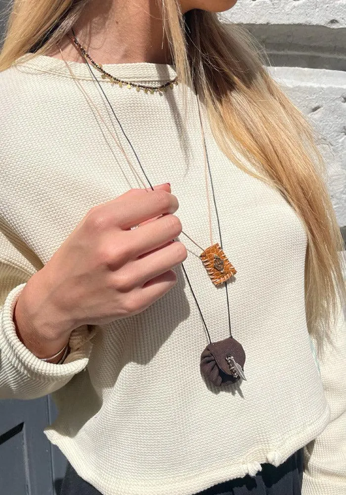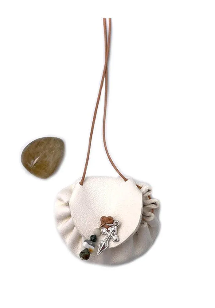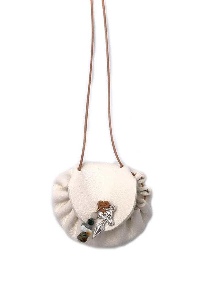 Sautoir Romy en forme de petite bourse en cuir blanc avec pampilles