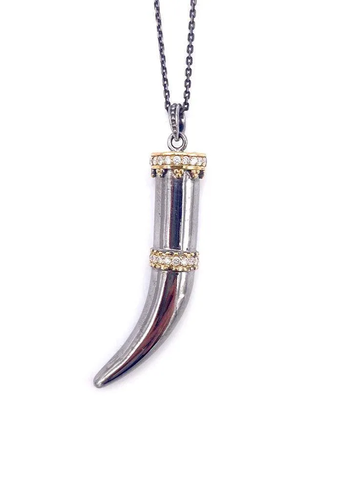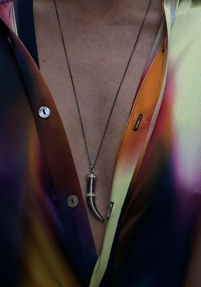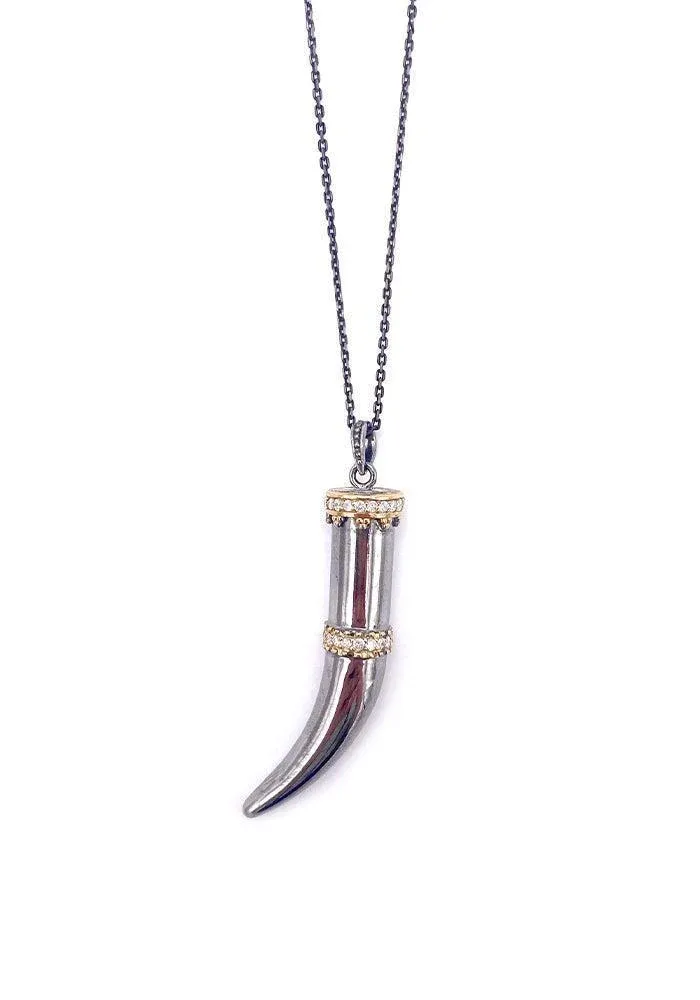 Sautoir Savage beauty avec une chaine en rhodium noir et un pendentif en argent 925 et rhodium décoré de motif en or jaune 9k pavés de diamants blancs.