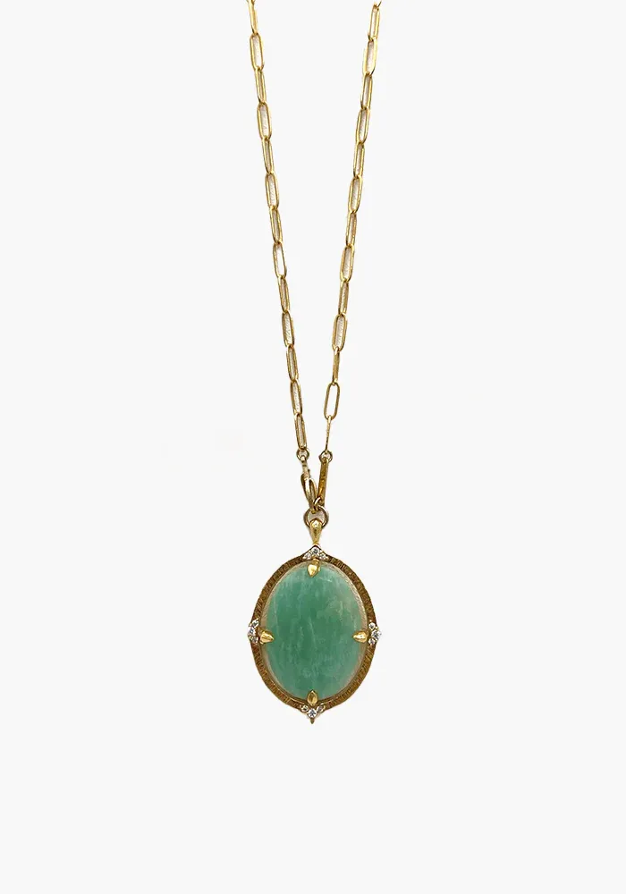 Sautoir Victoria avec une chaine faite de maillons ovales en plaqué or et d’un pendentif pierre ovale sertie et entourée d’un ovale et de zircons.