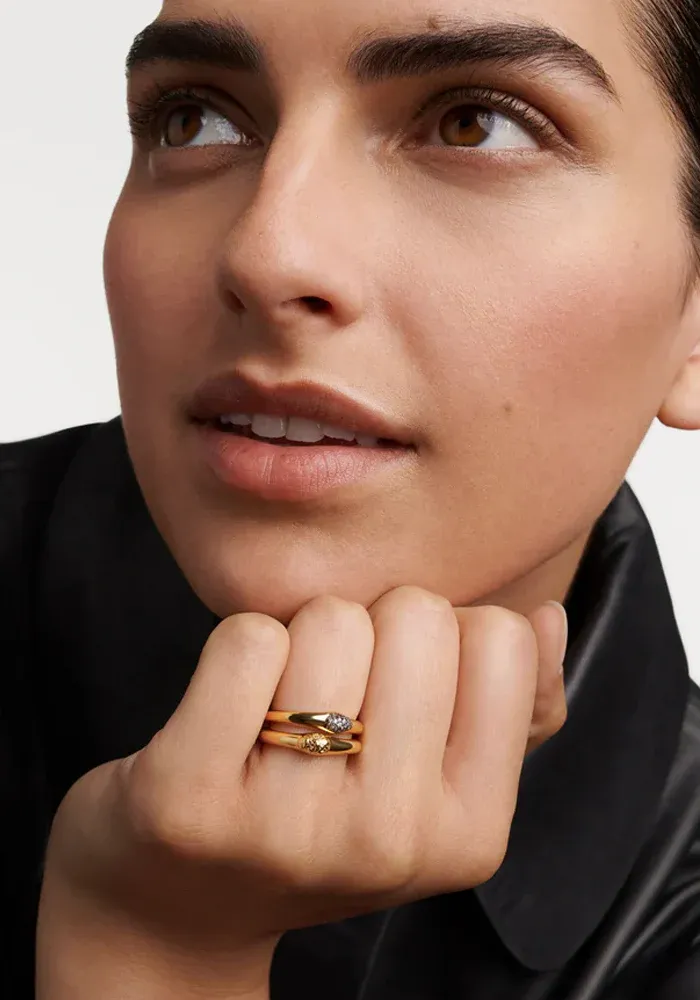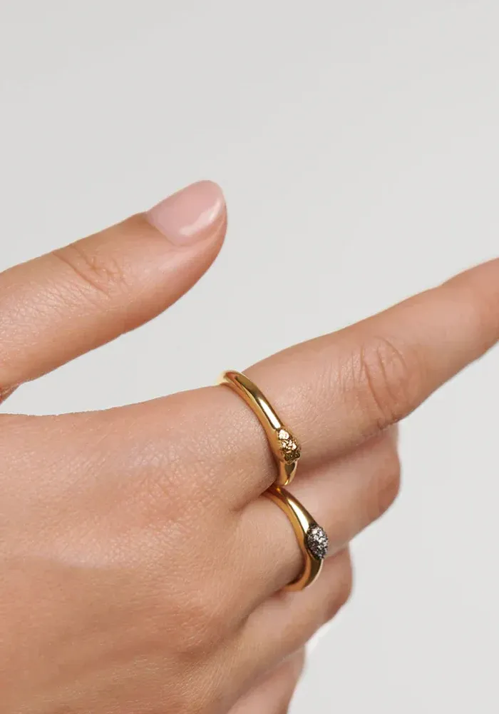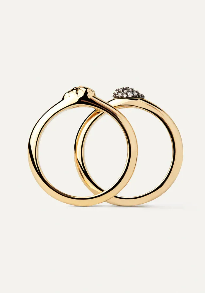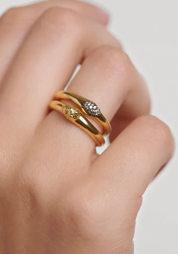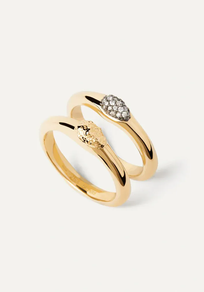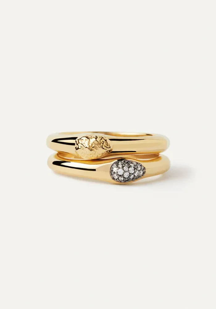 Set de 2 bagues The Rocks en vermeil bombées avec une goutte pavée de zircons blancs ou une goutte piquée.