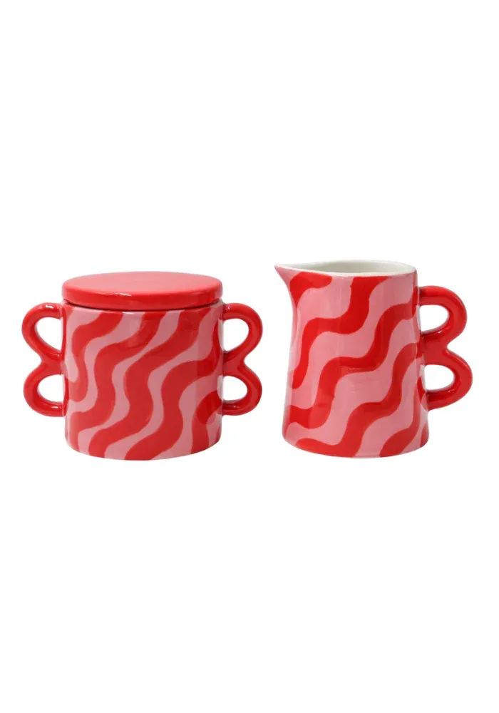 Set de 2 pots en céramique rouge et rose comprenant un pot à lait et un pot à sucre.