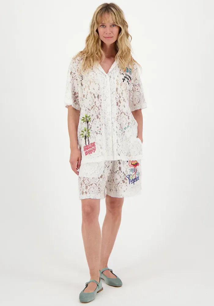 Short Sky en dentelle avec des flamants roses brodés sur le tissu et une ceinture élastique à la taille.
