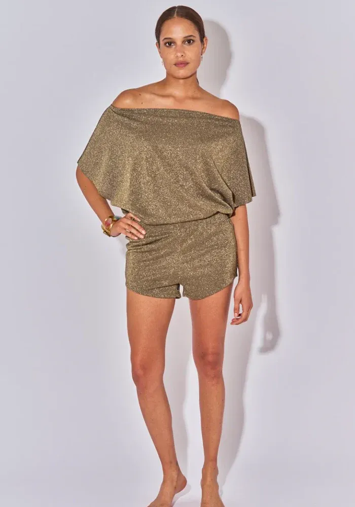 Short Thaïs court en tissu lurex kaki avec une ceinture élastique.