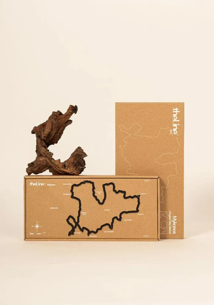 Silhouette murale de Mykonos vue du ciel en acier noir. On y voit d’Ouest en Est et du Nord au Sud : la ville de Myonos, le Cap Armenistis, la Baie de Panormou, le Cap Evros, Kalafatis et Drapano.