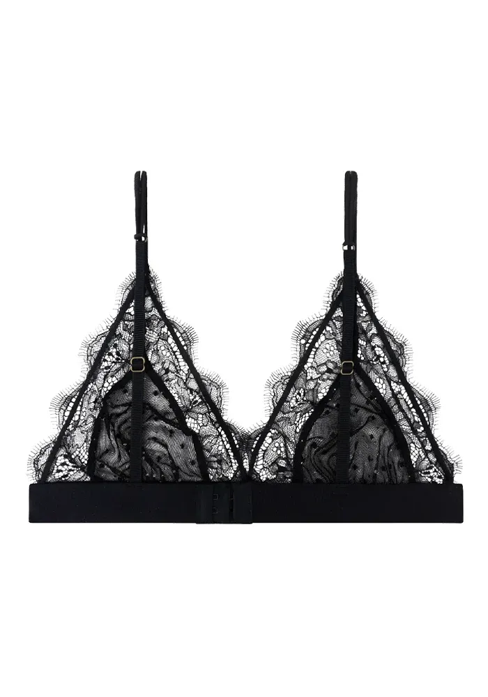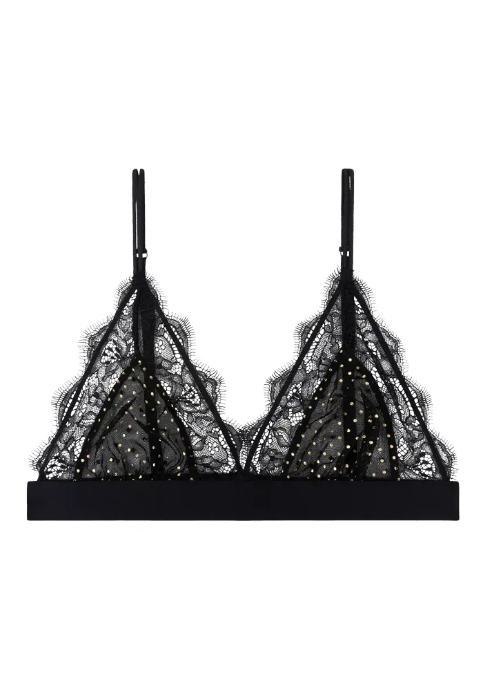 Soutien-gorge Love Lace en dentelle noir avec des pois dorés.