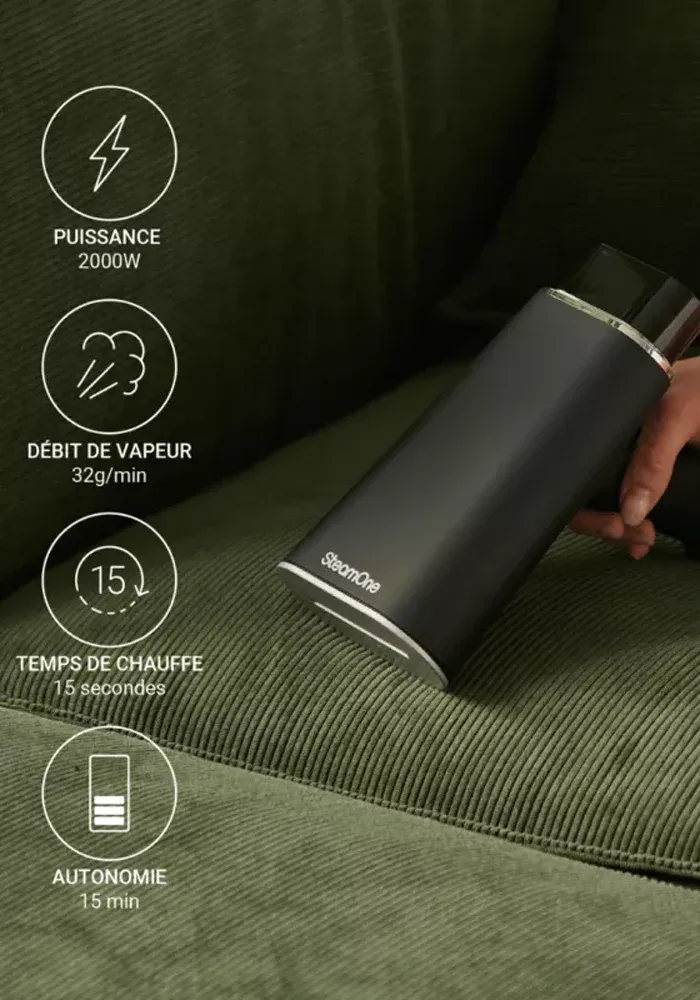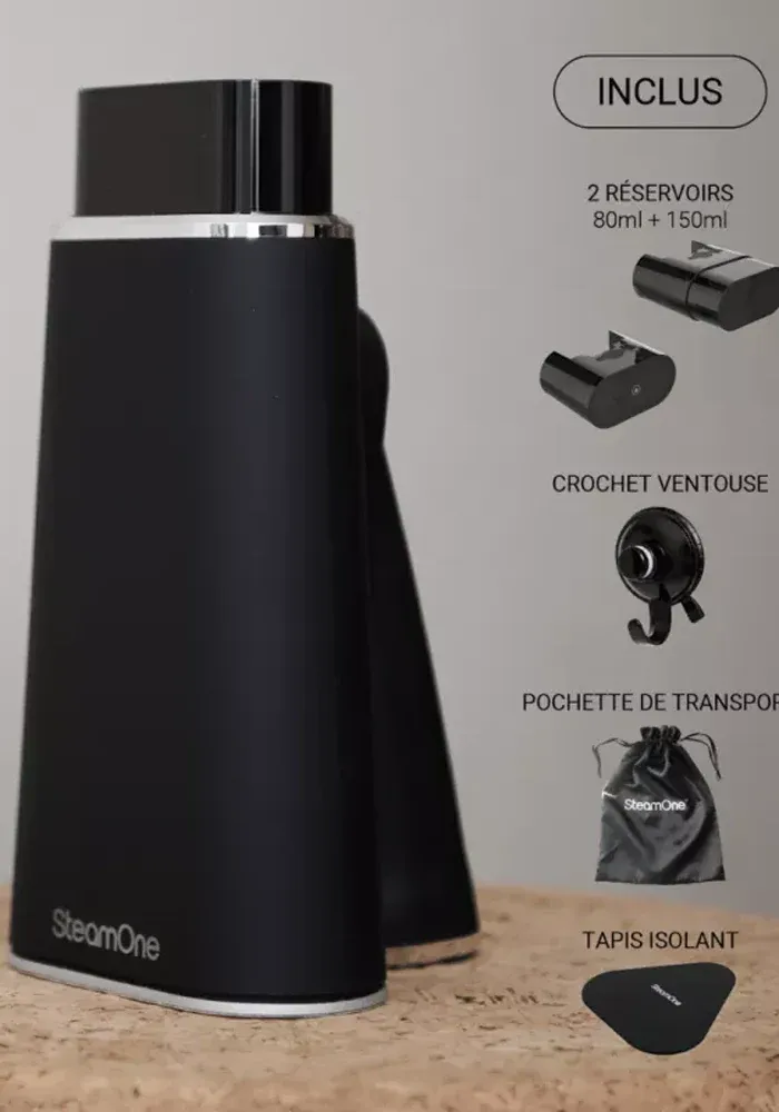Steamer portatif James Noir a une puissance de 2000 W et un réservoir de 150ml.