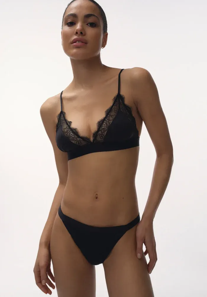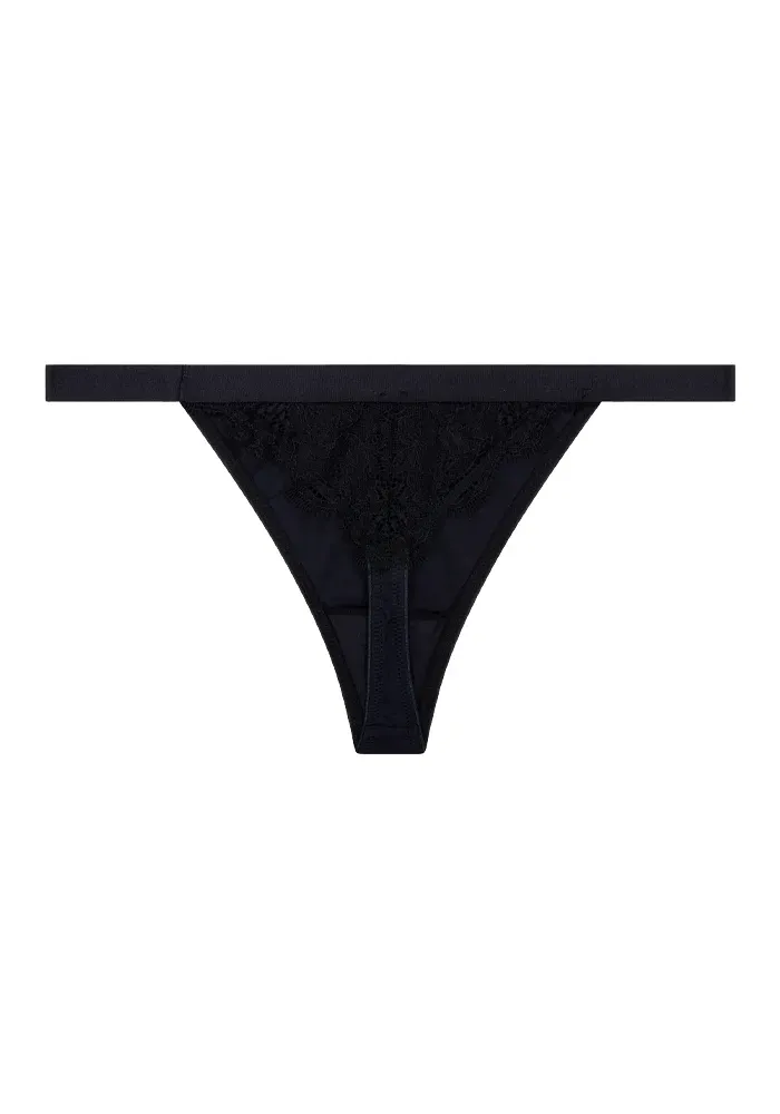 String Roomservice noir avec l’avant opaque et l’arrière décoré de dentelle noire.