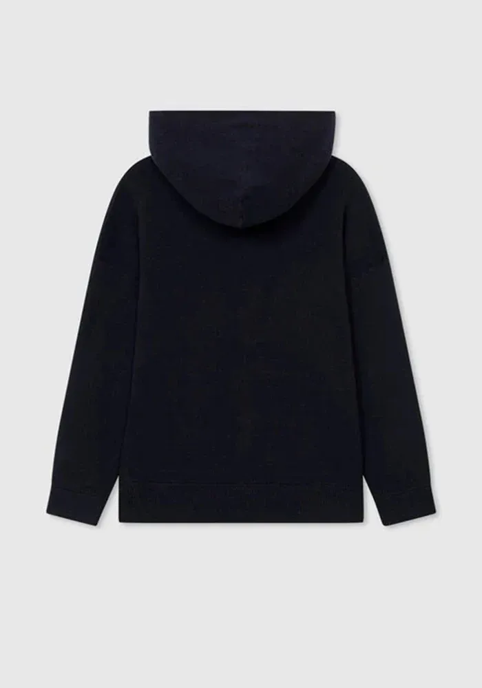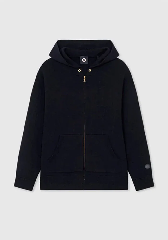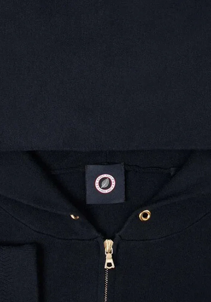 Sweat Knit Zipper bleu marine avec un zip, une capuche et une poche ventrale. Il peut aussi bien se porter ouvert que fermé.