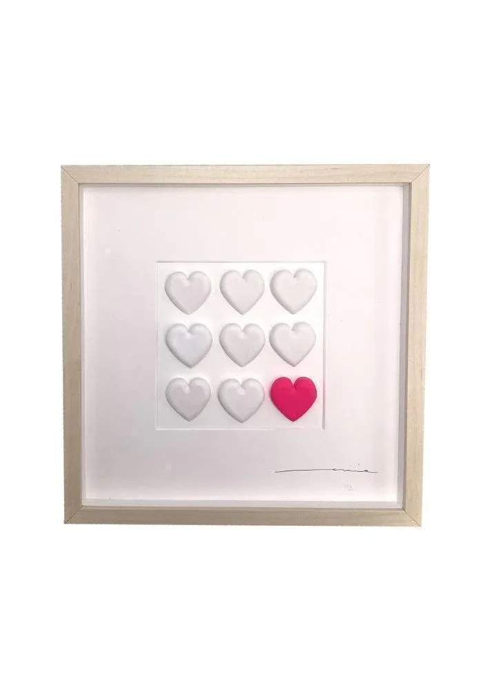 Tableau cadre bois clair et 9 cœurs : 8 blancs et 1 rose fluo.