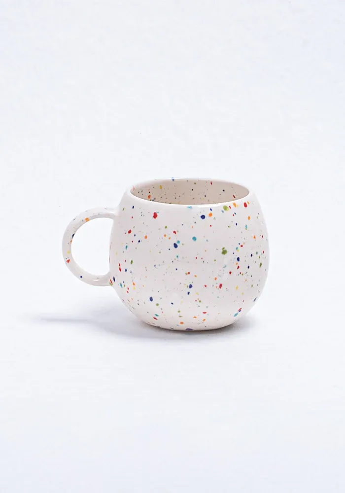 Tasse New Party Ball en céramique avec des tâches de peinture colorées.