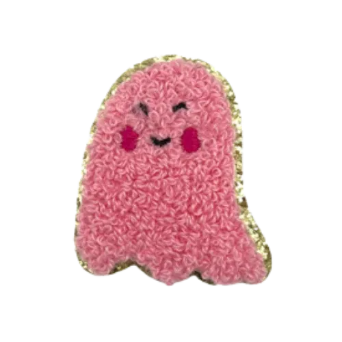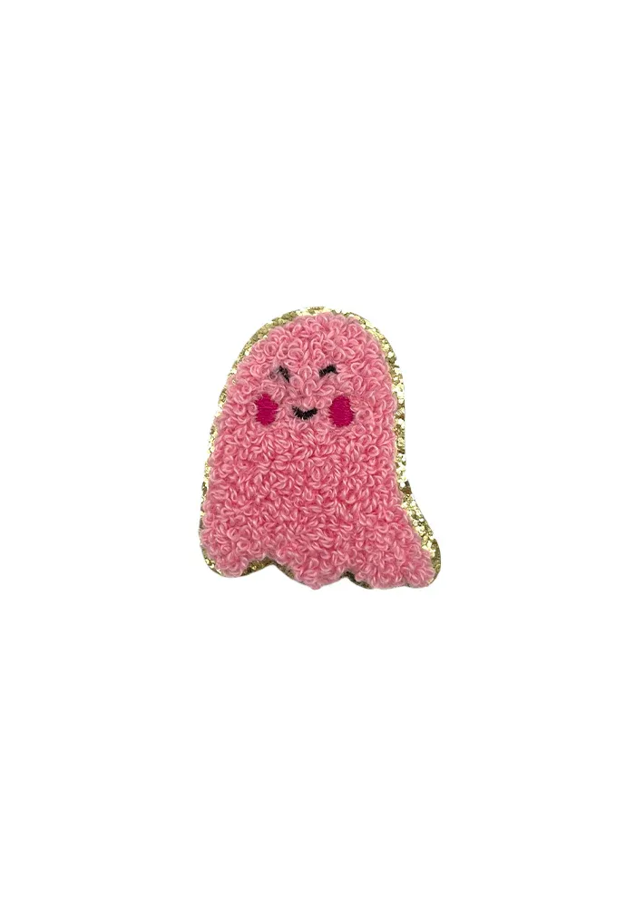 Thermocollant Columbia en forme de fantome dans un tissu effet moumoute et entouré de paillettes dorées. Ce patch peut être placé la pochette personnalisable de votre choix !