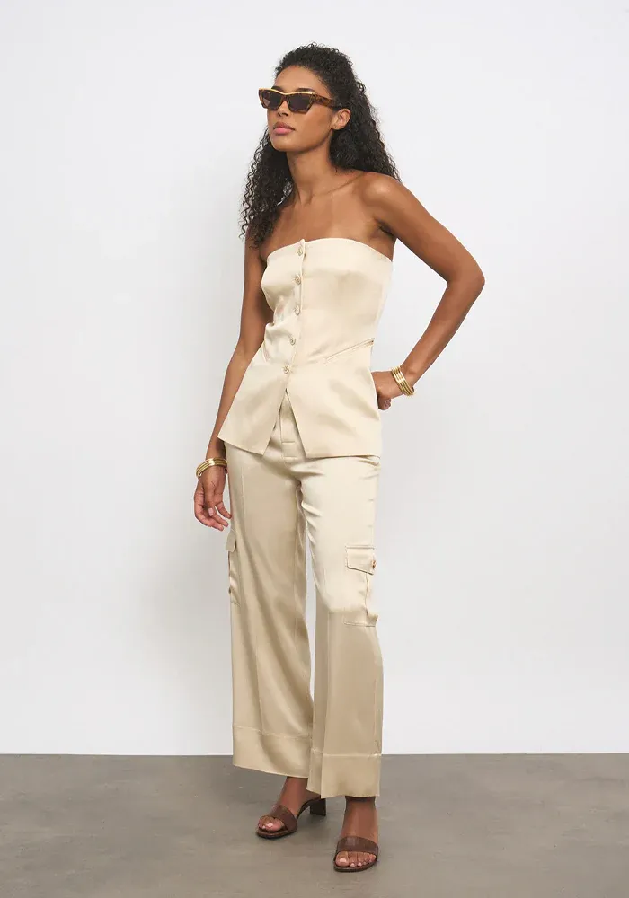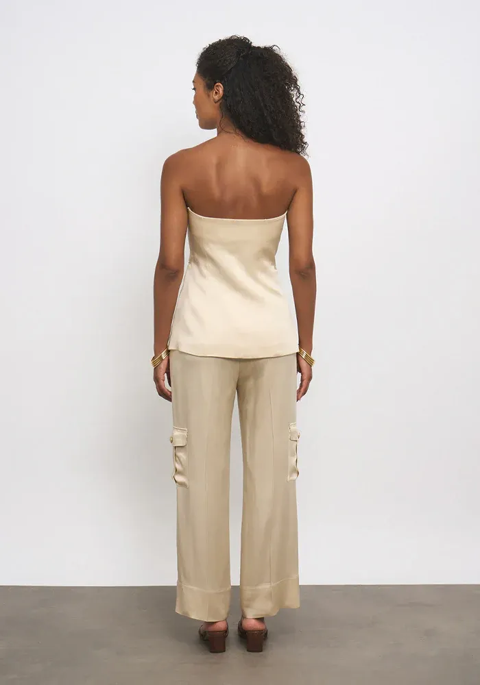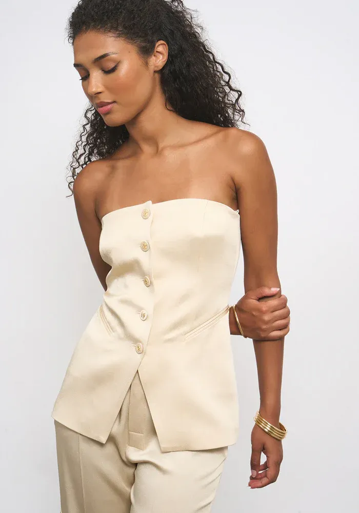Top Emma bustier effet veste avec 5 boutons et deux poches plaqués dans un tissus satiné.