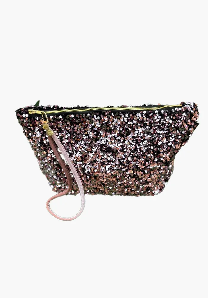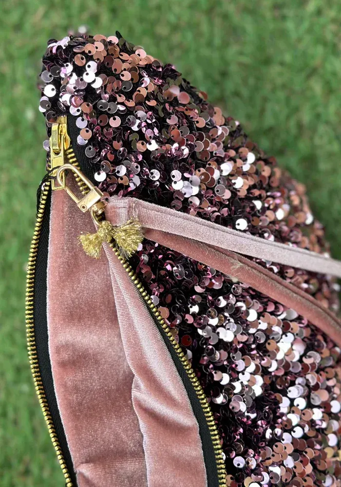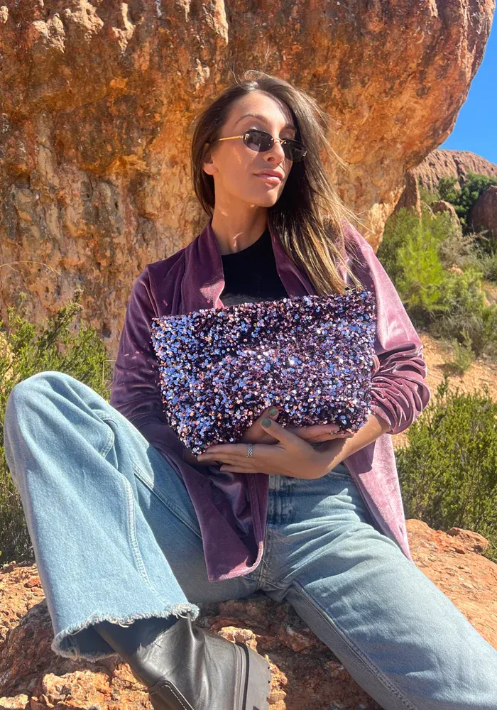 Trousse Eden Mykonos en sequins avec une anse en velours.