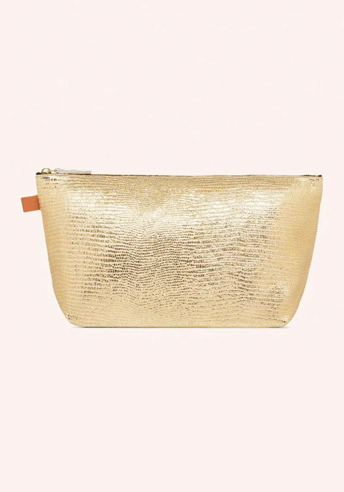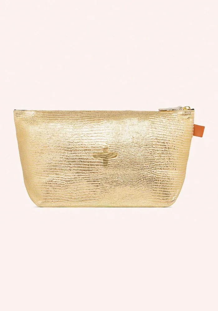 Trousse Mild Turtle Gold en cuir non doublée avec détail en cuir de tannage végétal.