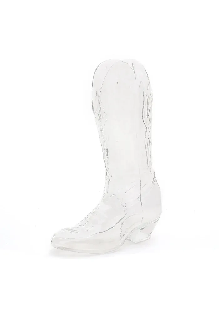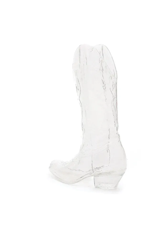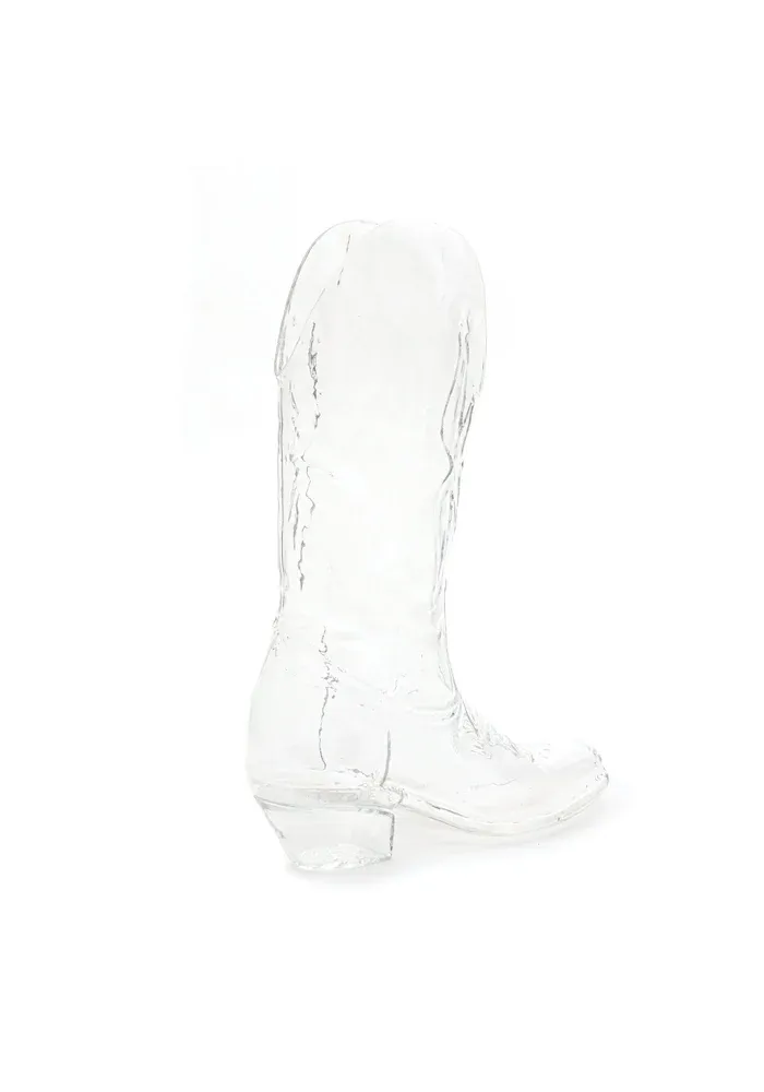 Vase Crystalbootie en forme de botte de cowboy en verre transparent.