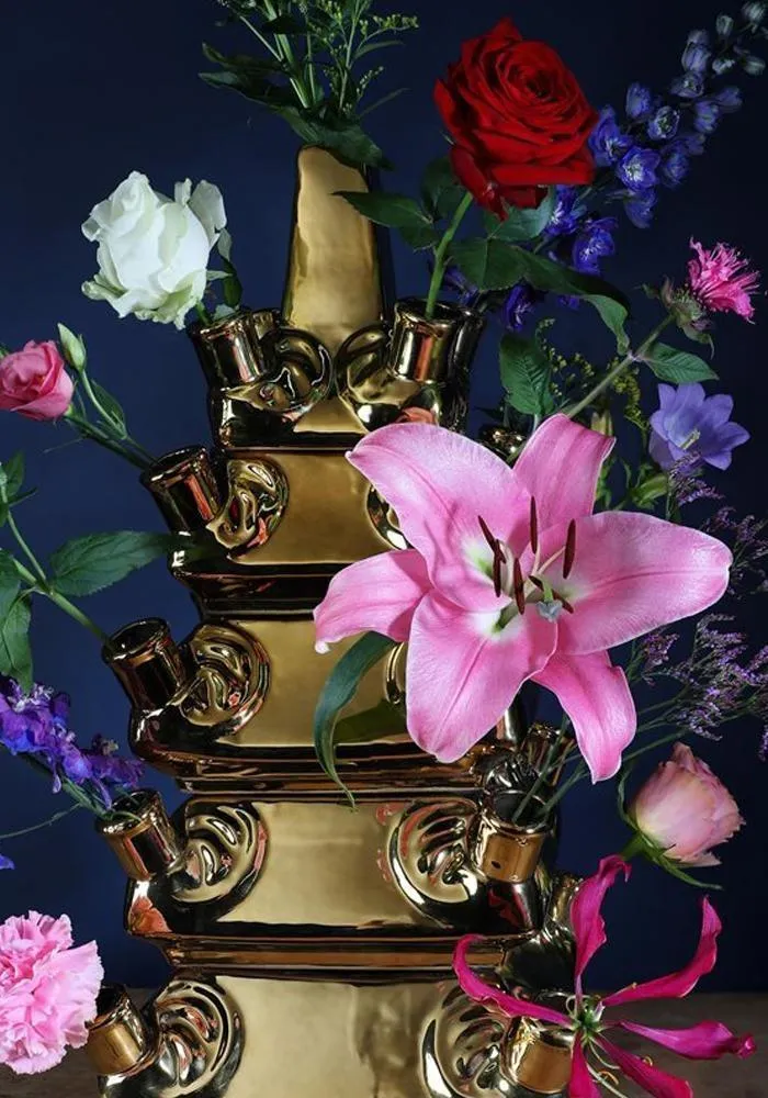 Le vase « Layer » doré est une véritable pièce d’art inspirée de l’élégance et de la beauté intemporelle des créations florales. Son design unique est basé sur une pyramide de fleurs, s’inspirant directement de l’artisanat traditionnel de la poterie Delft des années 1692-1700, réalisée dans la célèbre poterie « De Metalen Pot by Lambertus van Eenhoorn ».