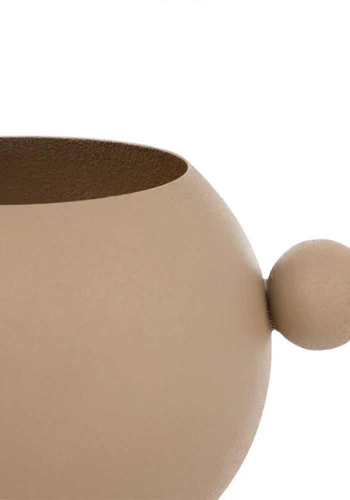 Vase rond marron avec deux boules sur les côtés.