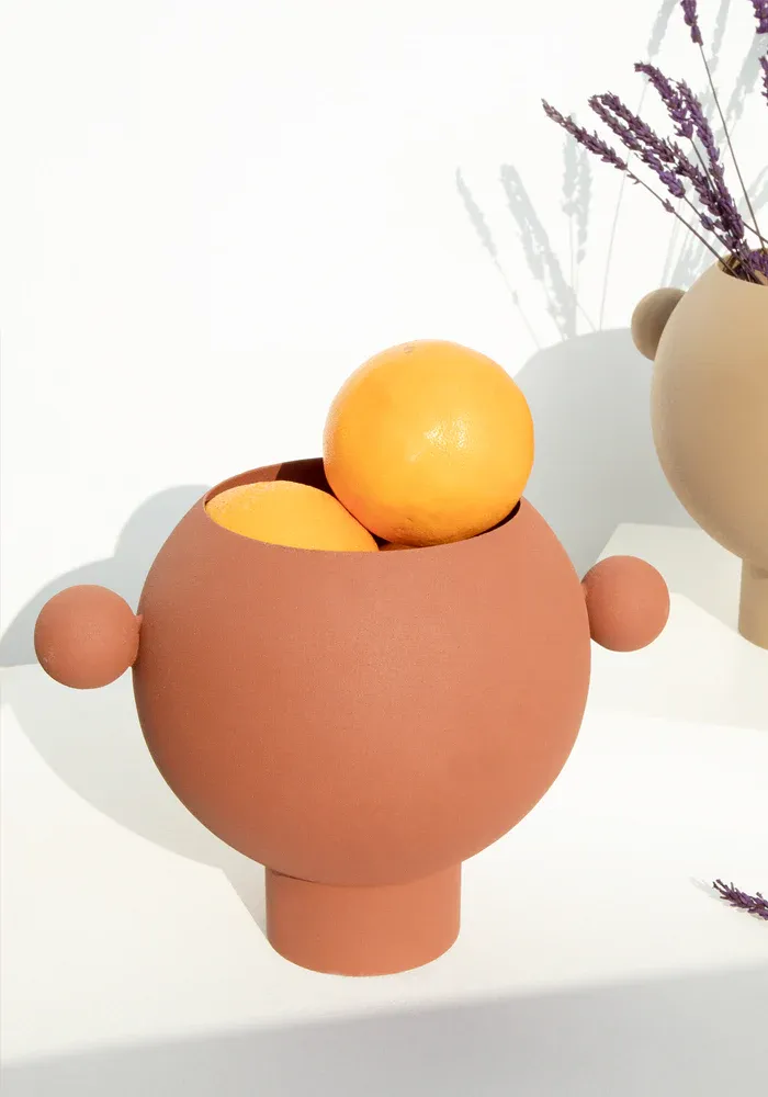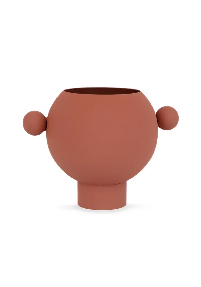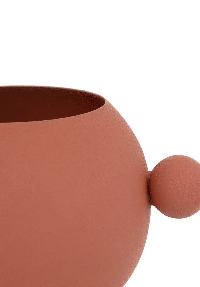 Vase rond terracotta avec deux boules sur les côtés.
