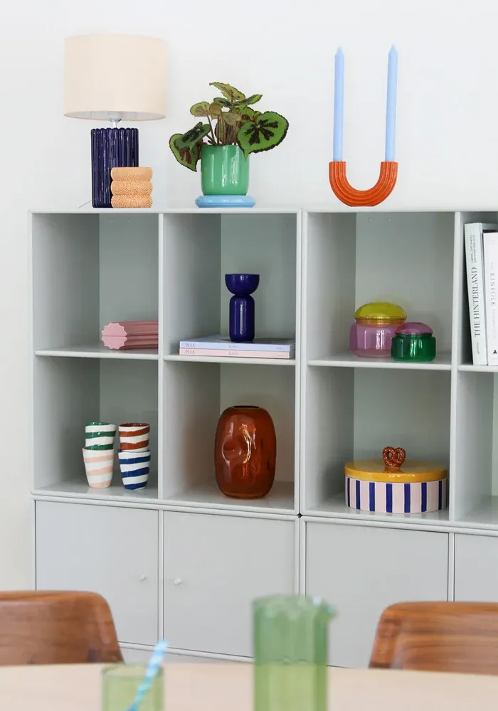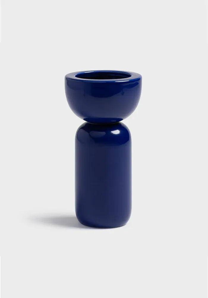 Vase Stack tube en dolomite avec une coupelle sur le dessus en céramique bleue.